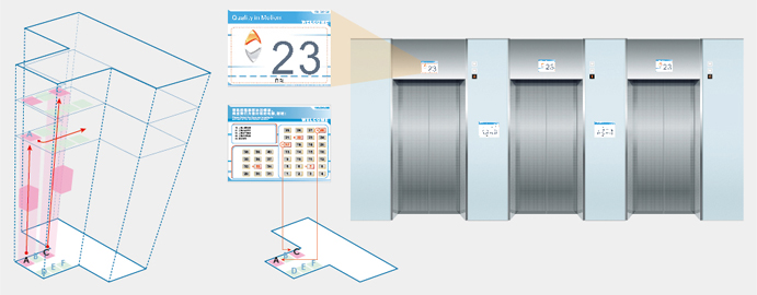 通过高效去向预报系统,大大提高电梯的利用率并缩短乘客的平均等候时间。当乘客在层站按下自己希望前往的楼层按钮后,去向预报系统会告知乘客乘坐指定的电梯,乘客即可前往指定的电梯前等候。当电梯到达后,无需乘客再在轿厢内按前往楼层的按钮,电梯将自动登记并将乘客送往目的层。